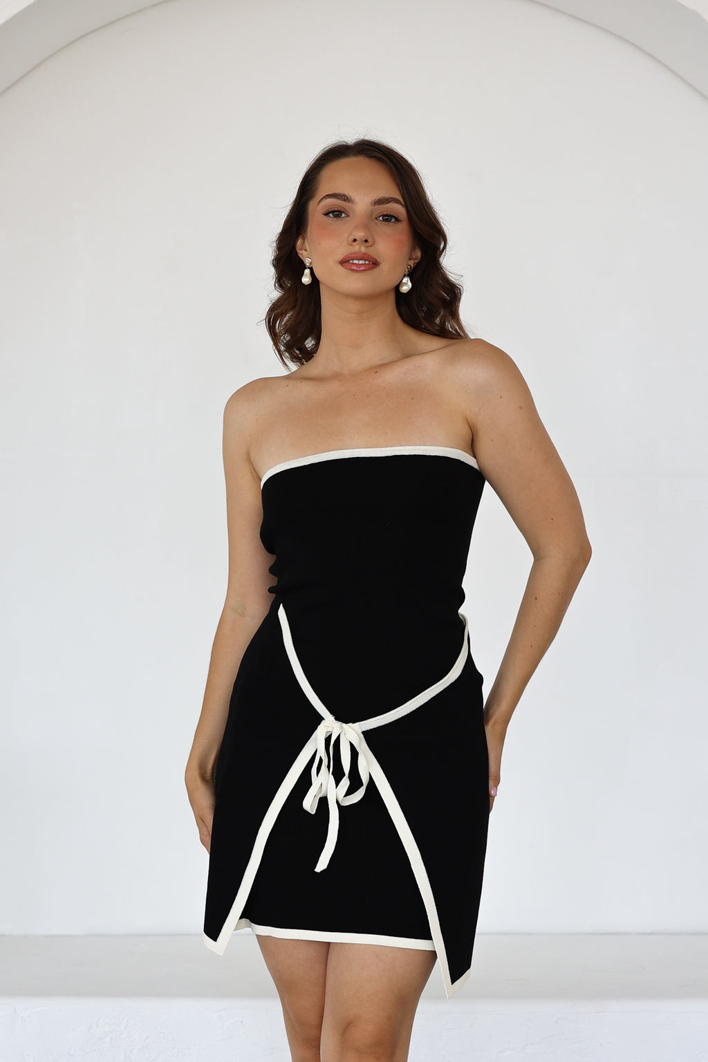 Effortless elegance with a modern twist. The Milan Mini is your elevated basic — designed with a flattering strapless neckline, contrast trim, and an asymmetric tie-front detail that gives it just the right edge. A staple for summer dinners, vacation nights, or whenever less is more.